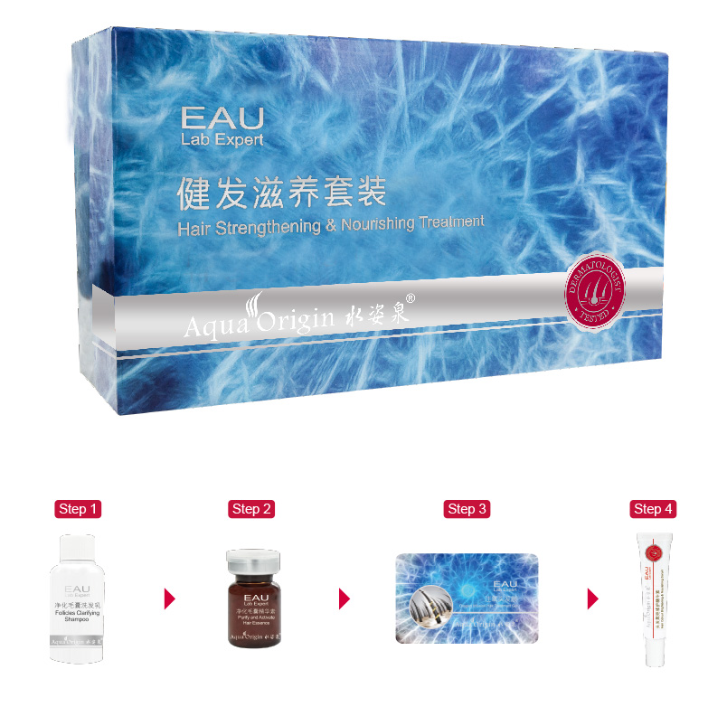 (2)洗发后,将5毫升的净化毛囊精华素置于头皮位置,按摩5-10分钟以加强精华的吸收效果,期后再用清水冲洗干净。